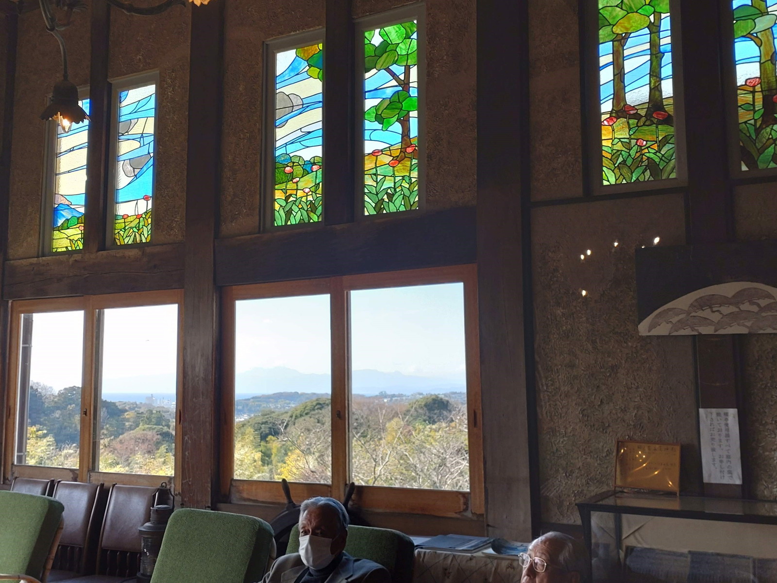 集合時間までに参加者全員がバスに乗車し、先ずは街外れの鎌倉山の中腹に立地する料亭「?亭」へと向かいました。?亭の前身は実業家の別荘だそうで、そこは広く起伏に富む敷地内に、各地から移築された山門・茶室・母屋等が立体的に配置されており、母屋からは相模湾をよく見渡せます。また母屋内部には明治初期に作成されたステンドグラスやシャンデリアで彩られて、実業家の別荘で有った頃の趣に満ちていました。