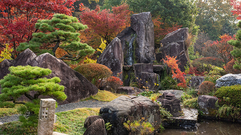 東広島の田園地帯の一角に、なだらかな谷筋の地形を上手くいかし、一万二千坪の敷地の中に、特徴的な庭石群を魅力的に見せる庭園を複合的に配置して、石の持つ魅力と花木の調和をゆっくりと楽しめます。また、「仙石庭園」は、日本で唯一の庭石に関する博物館として学術資料の展示や研究、保管の役目も有しています。